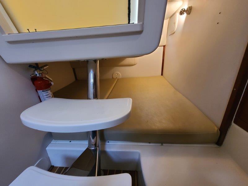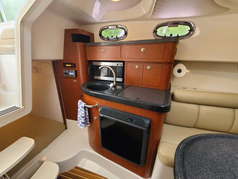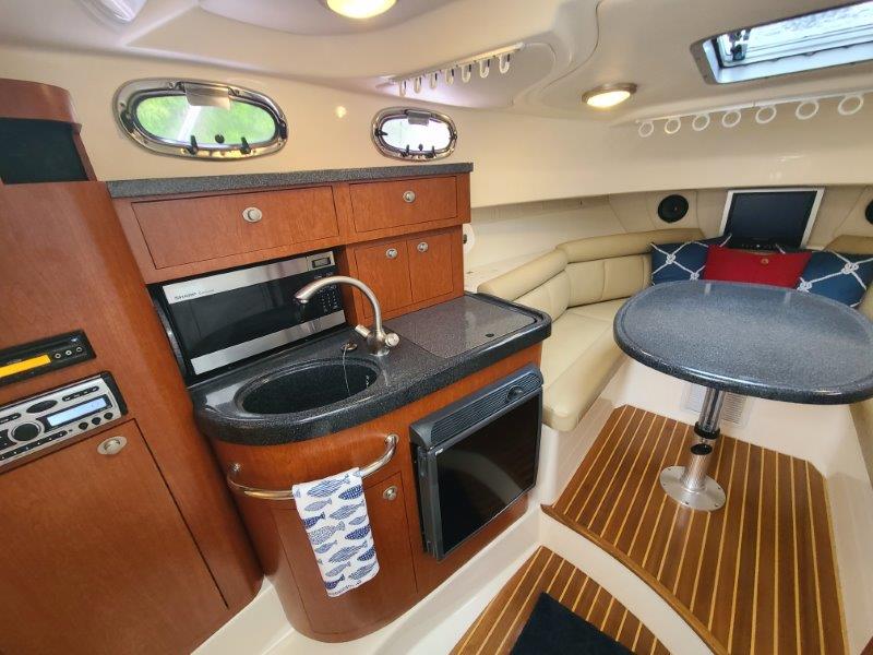 A full galley with stove, oven refrigerator, sink and lots of storage. There is sleeping for four and a dinette for mealtime. The 305 Conquest boasts an impressive 58 square feet of cockpit space and is a perfectly balanced design for both fish fighting or entertaining. Its helm deck area is elevated for superior visibility fore and aft. The recessed bow walk-around provides more secure-feeling access to the anchor locker and bow area. The cabin interior is warm and inviting, thanks to rich accouterments including cherry cabinetry, granite-colored counter tops and decorator vinyl and accents. You don’t have to sacrifice comfort for fishability. New boat trailer available for purchase separately.