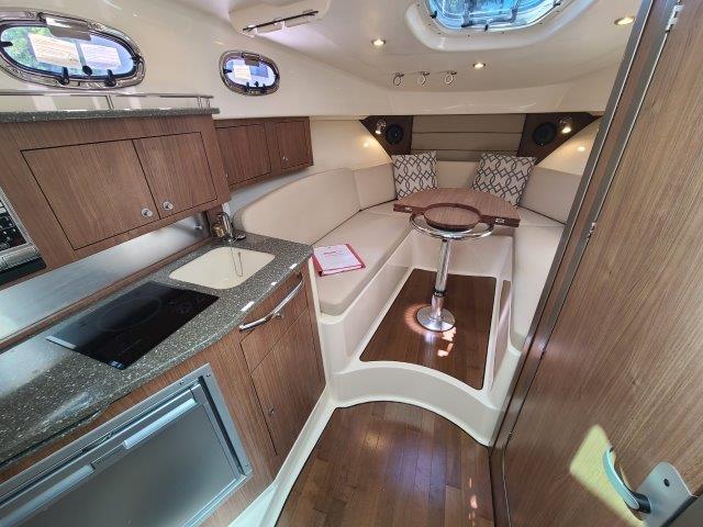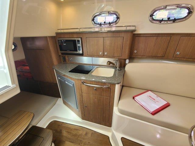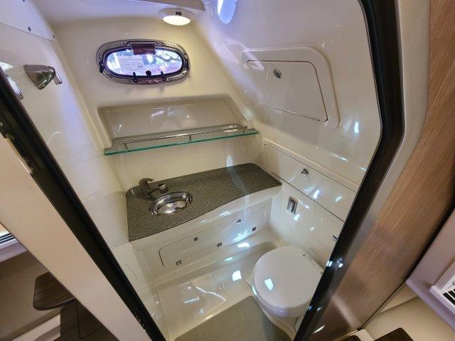 The 315 Conquest is a fishing and pleasure boat that has it all: enhanced utility, ultimate convenience and stylish comfort. The boat features a host of functional and aesthetic upgrades that are bound to impress both saltwater anglers and those who favor luxury cruising. A full front windshield and full side glass provide a clear, unobstructed view from the helm.  A cockpit bait tank, second transom bait tank, bait prep station with sink, and dual in-deck fishboxes ensure the diehard angler has everything he needs to get on the fish. The boat’s cabin features new interior styling, including a skylight over the galley, and an expanded mid-berth offering improved headroom and flexibility for bringing on extra family members or friends. Master the offshore with the power and fishability of the 315 Conquest.